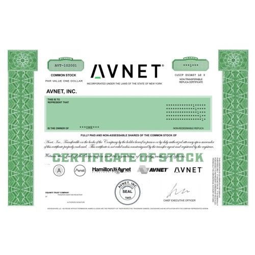 Already own Avnet stock? Turn your investment into a cherished memento with our replica Avnet stock certificate intended for those who may already hold shares in a brokerage account, index fund or any other investment account. The recipient gets a physical keepsake that is personalized with their name and number of shares they may already own.